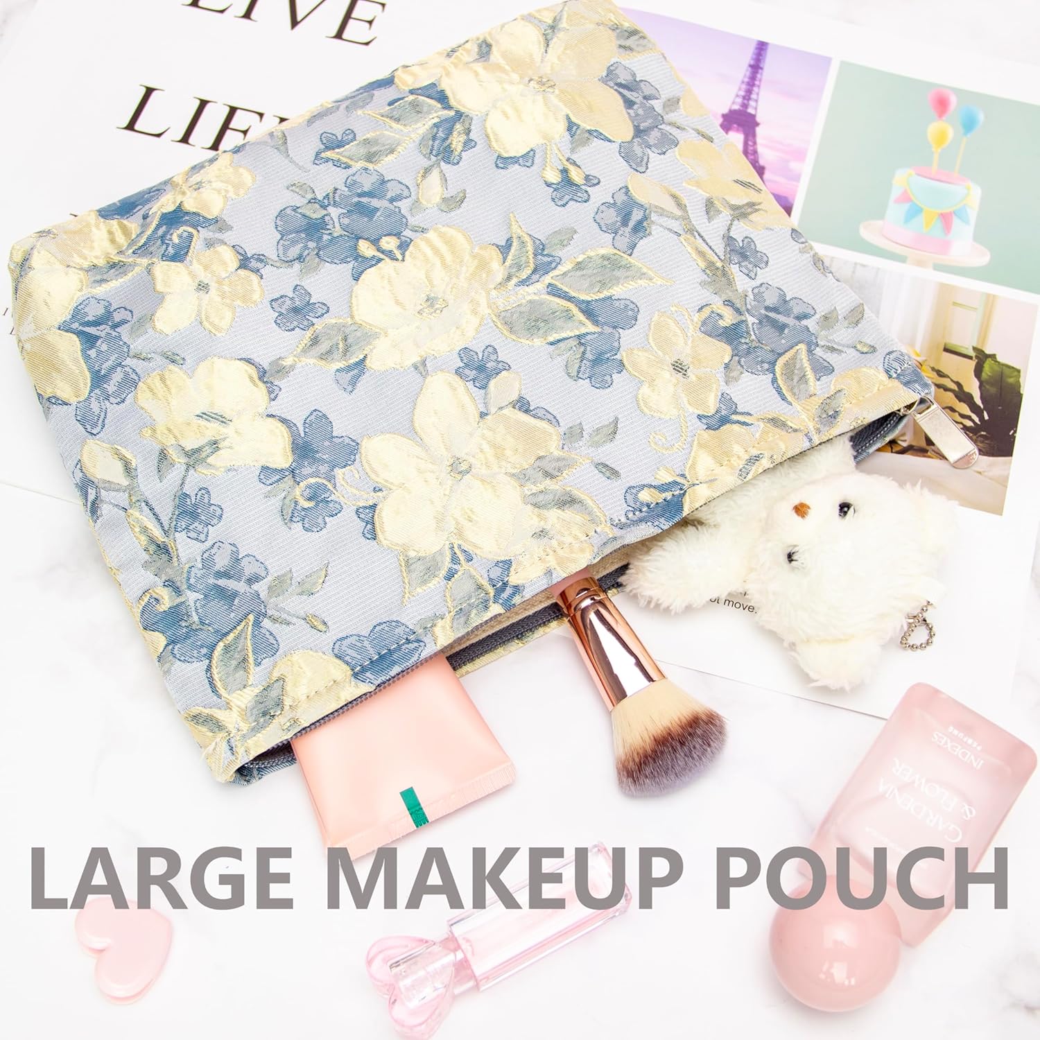 PAZIMIIK Makeup Bag Large Cotton Zipper Pouch for Purse Travel Canvas Make Up Organizer for Women Cosmetic,Brocade Blue