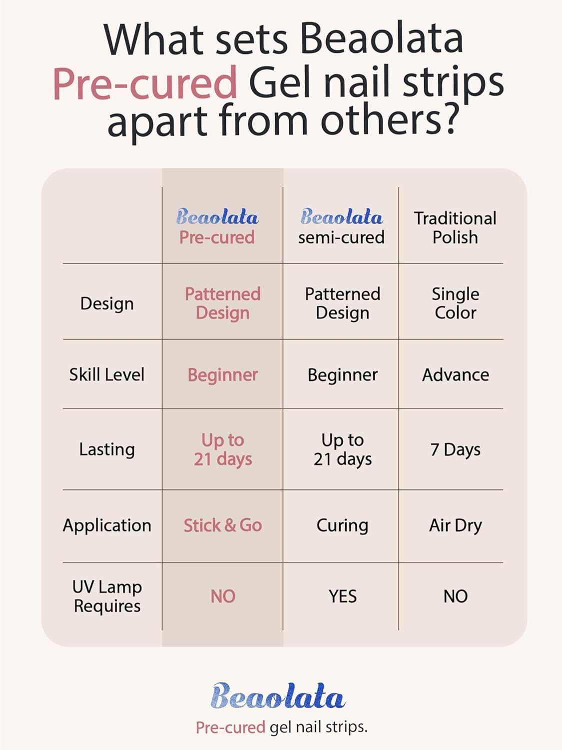 - Pre-Cured gel nail strips : Beaolata pre-cured gel nail strips utilize innovative technology that combines color gel with top coat gel, Professional Nail Results but no UV Lamp Needed.
