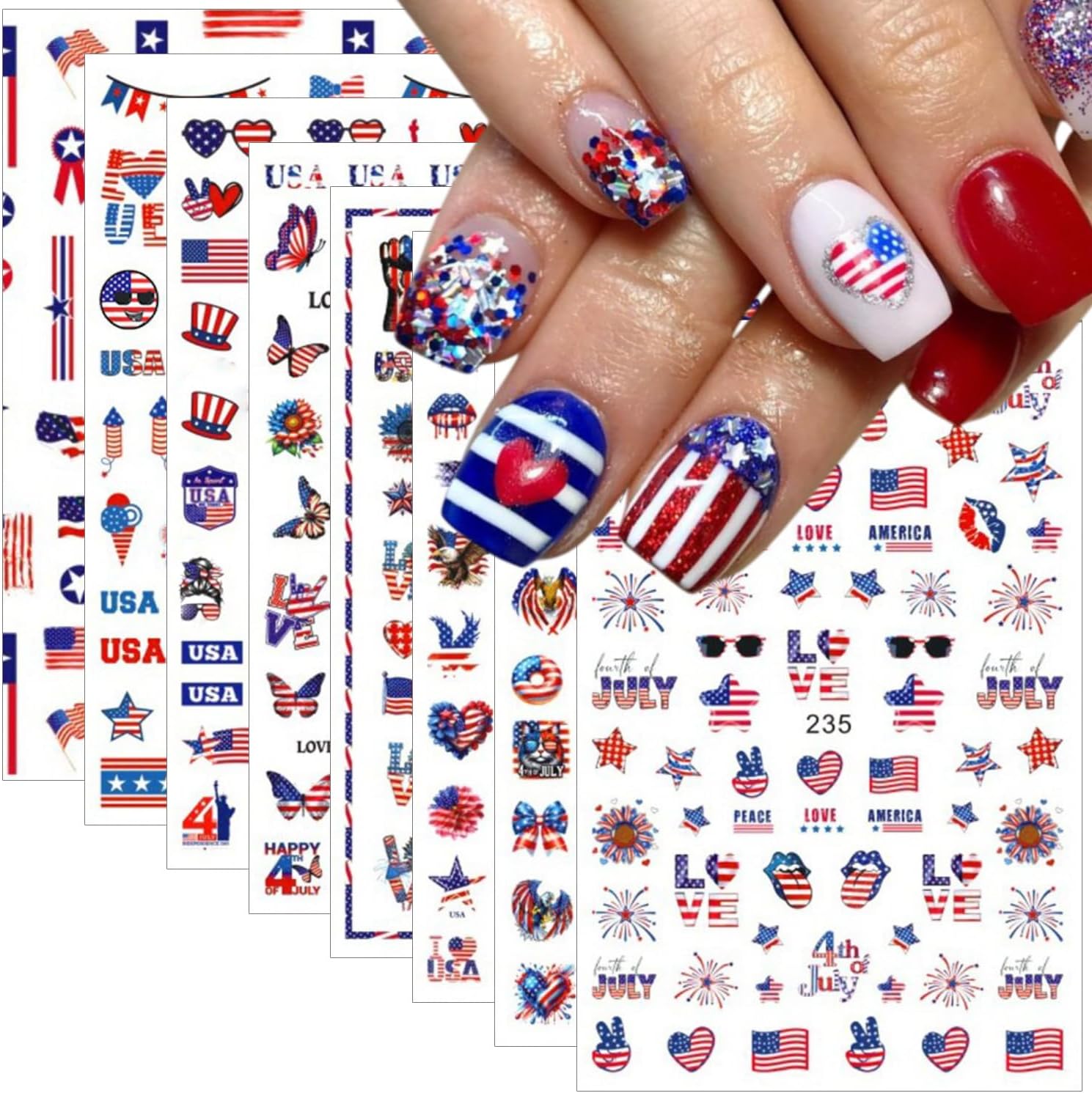 - Widely Used: These 4th of july USA letter heart flag nail supplies are suitable for professional nail salons and home use. These sun moon star nail decals is very suitable for 3D nail art, glitter nail art, arts & crafts, holiday decorations, face, body, nails, cell phone case, invitation card and etc. Nail decals are great gifts for nail lovers.
