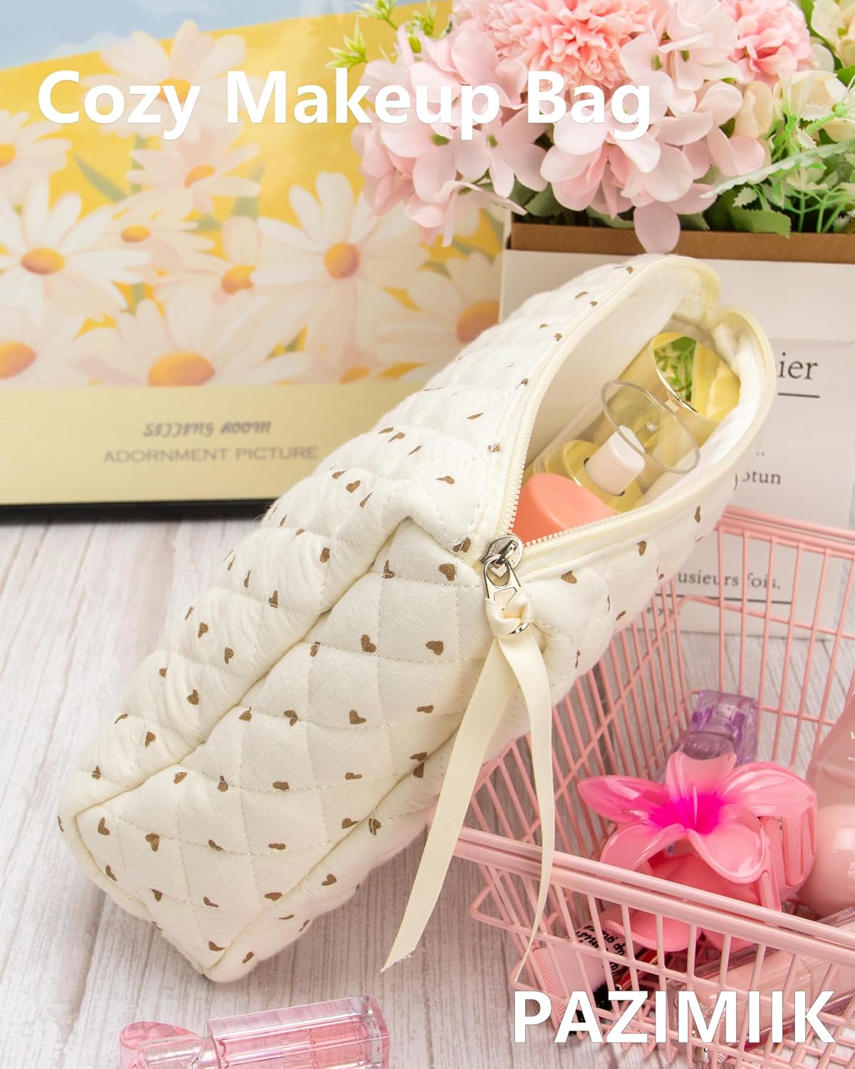 PAZIMIIK Quilted Makeup Bag Large Travel Zipper Soft Cosmetic Pouch for Women Girls Make Up,Gauze Heart Coffee