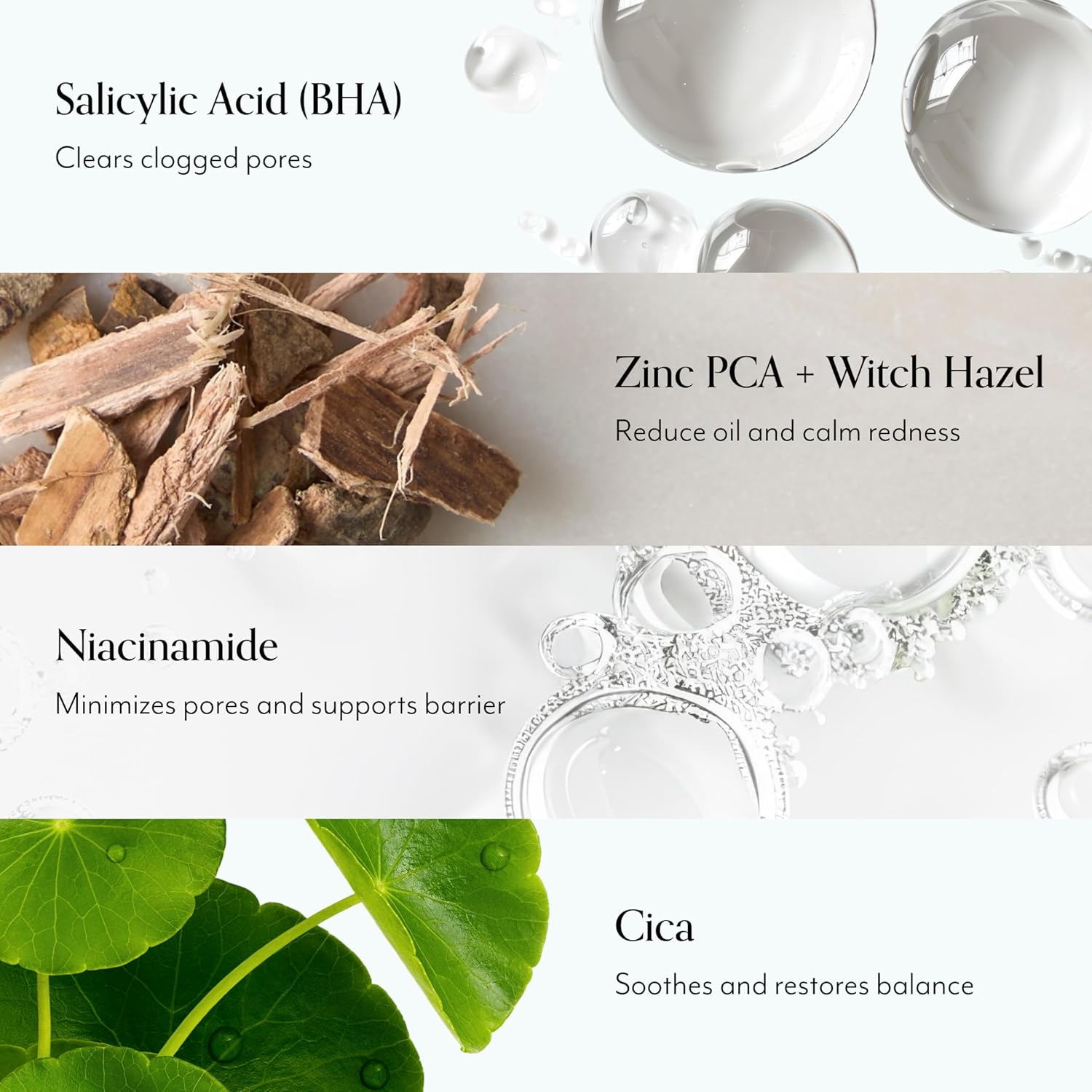 - KEY INGREDIENTS: BHA (SALICYLIC ACID): Helps loosen dirt and excess oil from congested pores while promoting the easy removal of dead skin on the surface. WITCH HAZEL: A natural astringent that helps soothe and tone while decongesting clogged pores. NIACINAMIDE: Helps minimize the look of pores and blemishes while boosting skin’s protective shield. ZINC PCA: Helps to regulate skin’s oil production while calming the appearance of redness. CICA: Known to calm and soothe skin."