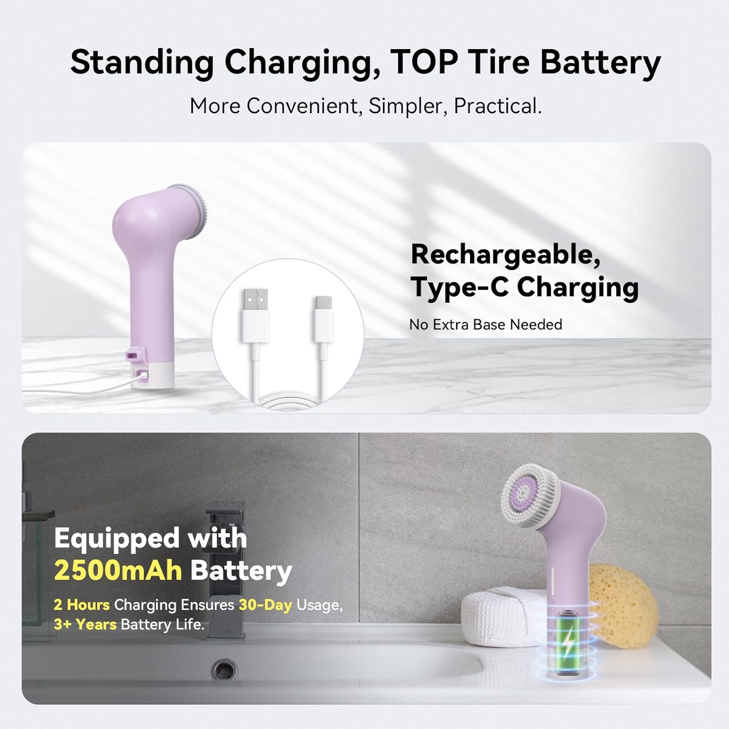 - 【Long-Lasting Rechargeable Battery】This rechargeable face scrubber (a standout electric facial cleansing brush) has a 2500mAh battery: charge 2 hours, use 30 days. It lasts 3 years, powering both the Silicone facial scrubber and exfoliating face scrubber heads reliably—whether at home or traveling.