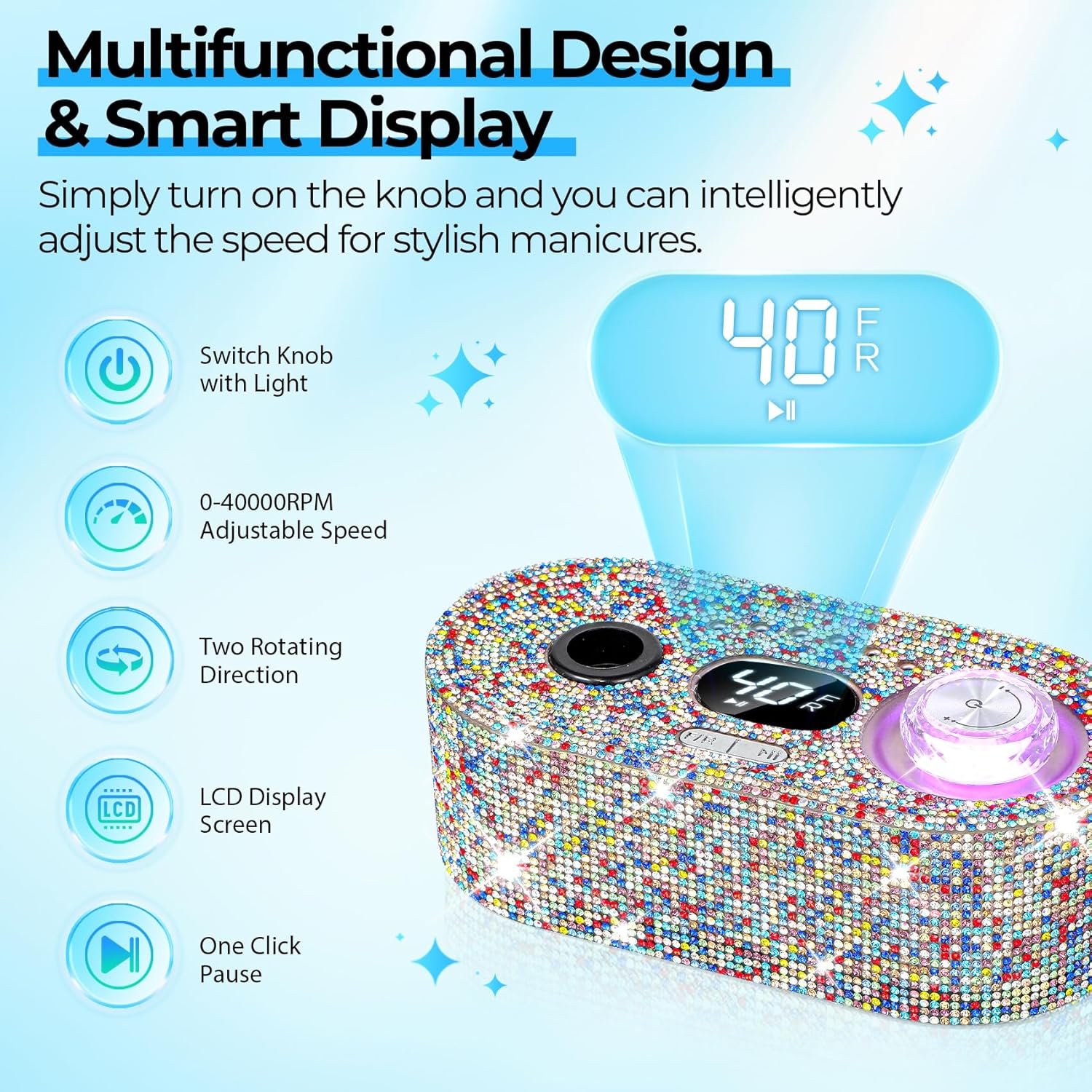 - 40000RPM Powerful Nail Drill Machine: Enjoy the fun of a bling bling AB Diamond that is covered with the drill body! JOSGLOI professional nail drill has a high-torque motor that delivers stable current power and speed, ensuring smooth operation even at high speeds (up to 40,000 RPM). Stable current and movement is a prerequisite for high speed, even the hardest nails can be easily handled. (Note: The JOSGLOI electric nail files are not rechargeable model)