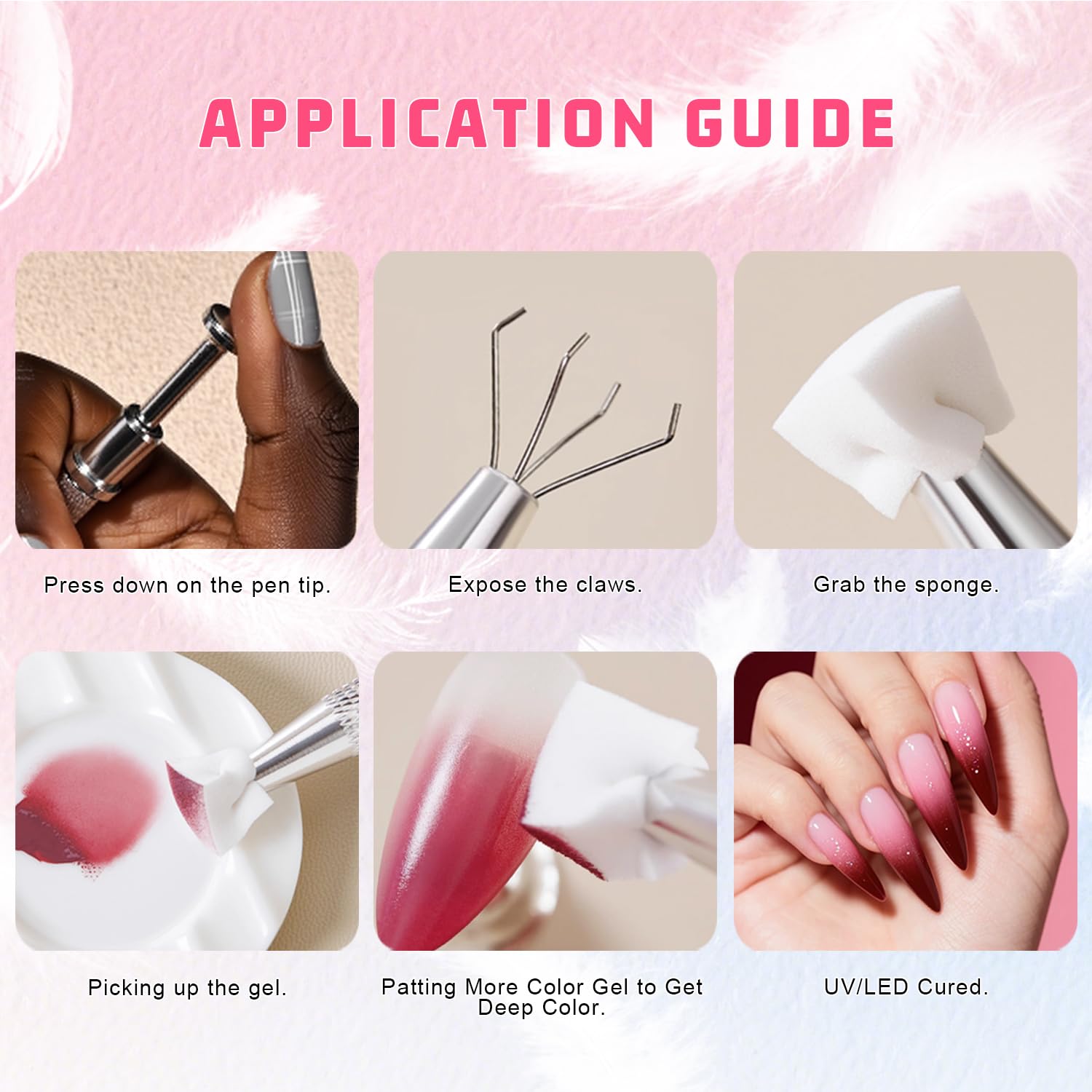- 【WARM TIPS:】The solid nail gel need to be cured under UV/LED light. For a seamless gradient, lightly dab the sponge onto your nails. Avoid pressing too hard, as this can create an unnatural look.