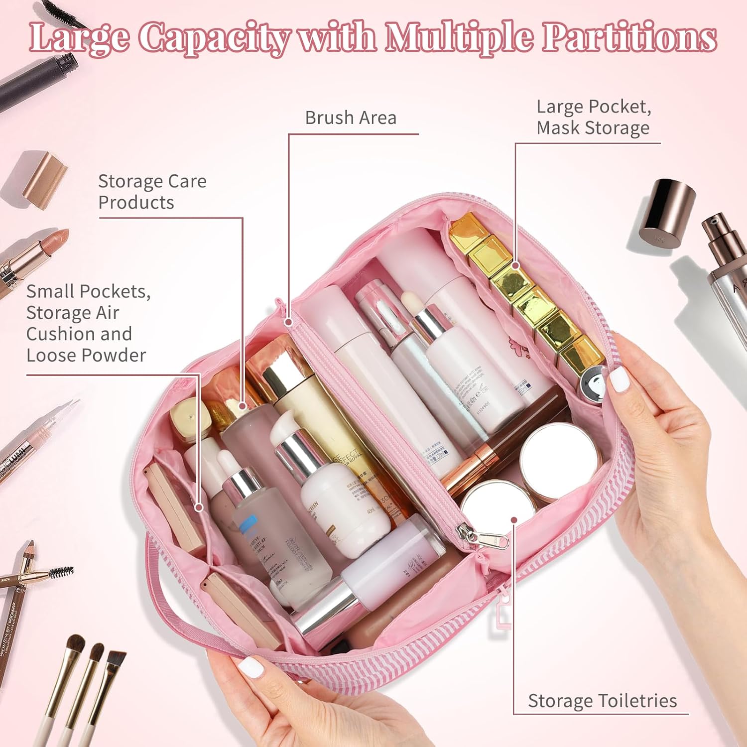 - Quick Access Design - Portable 180°wide-open flat makeup bag with different sized pockets and 2 main compartments, 1 clear pocket for integrated storage of cosmetics, brushes and skin care. No more digging - Effortlessly get all makeup elements right away.