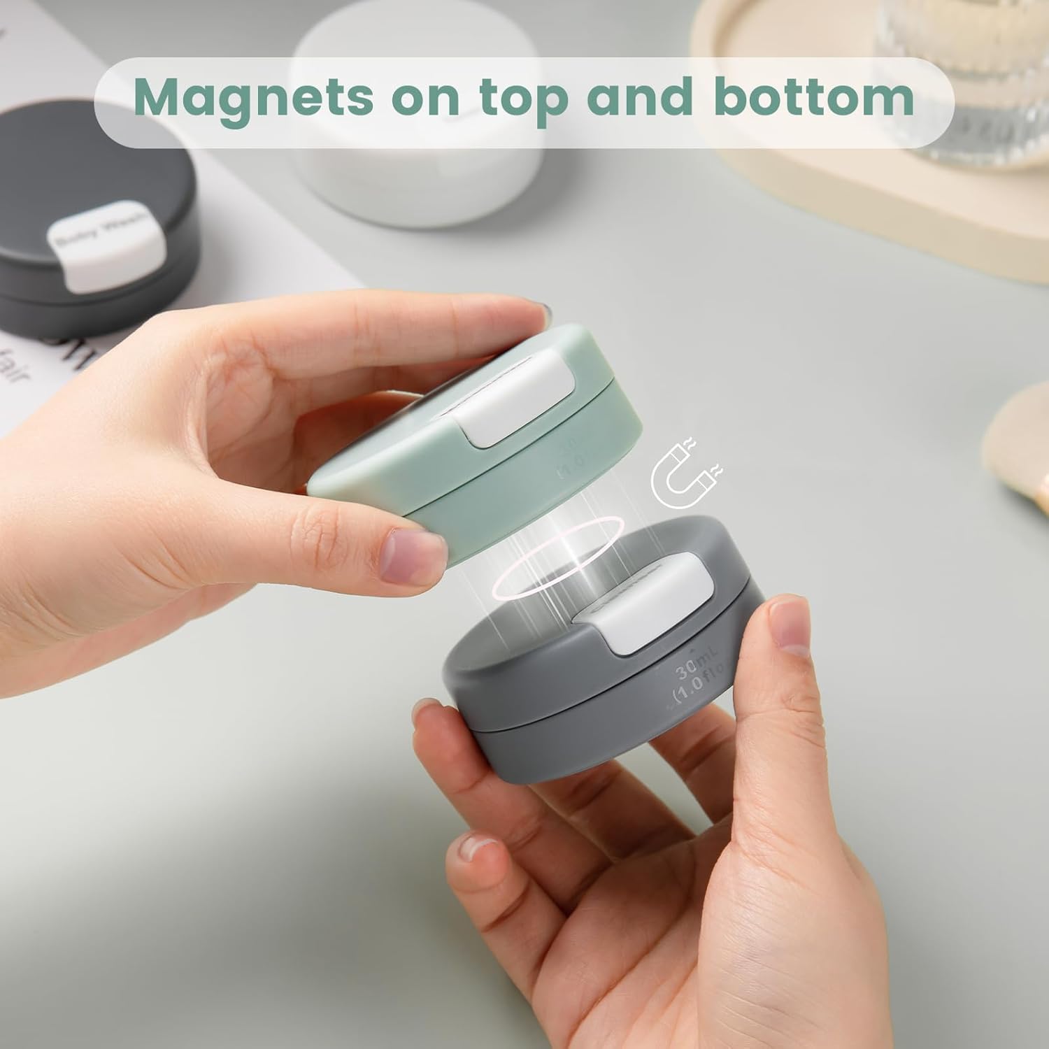 - Magnetic Design: Our travel containers feature a magnetic design that connects each container vertically. They include magnetic labels that seamlessly swap between all of Capsules.