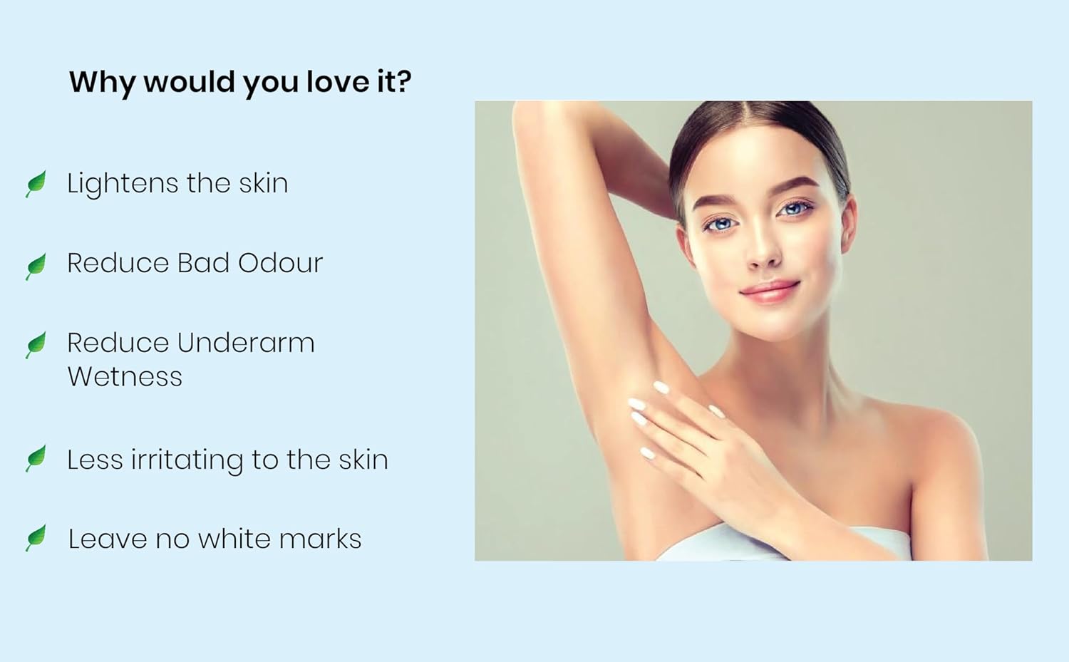 - BRIGHTENS & LIGHTENS UNDERARM: Formulated with AHA, Kojic Acid, and Licorice Extract to visibly reduce dark spots and pigmentation for brighter, even-toned underarms.