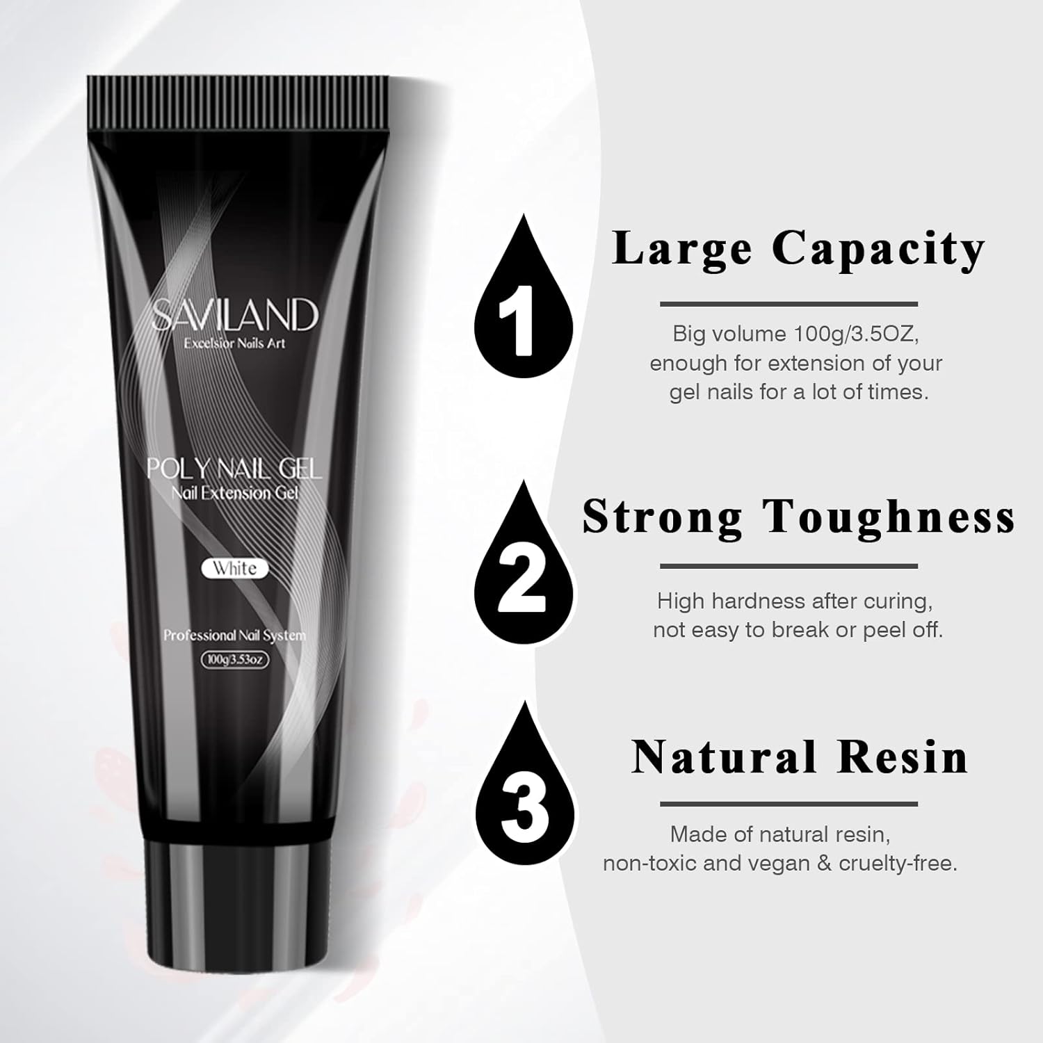 - 🌷 SAVILAND WHITE POLY NAIL GEL-Saviland 100g/3.5oz white poly extension gel with popular classic color, can do nail extension, poly gel nails, nail enhancement, nail art, stick sequins or decorations, etc. 100g super large capacity, valuable, and long service life. It is very suitable for professional nail salons and nail lovers who often make extension. Can mix with other colorful gel to create various and attractive nail art.