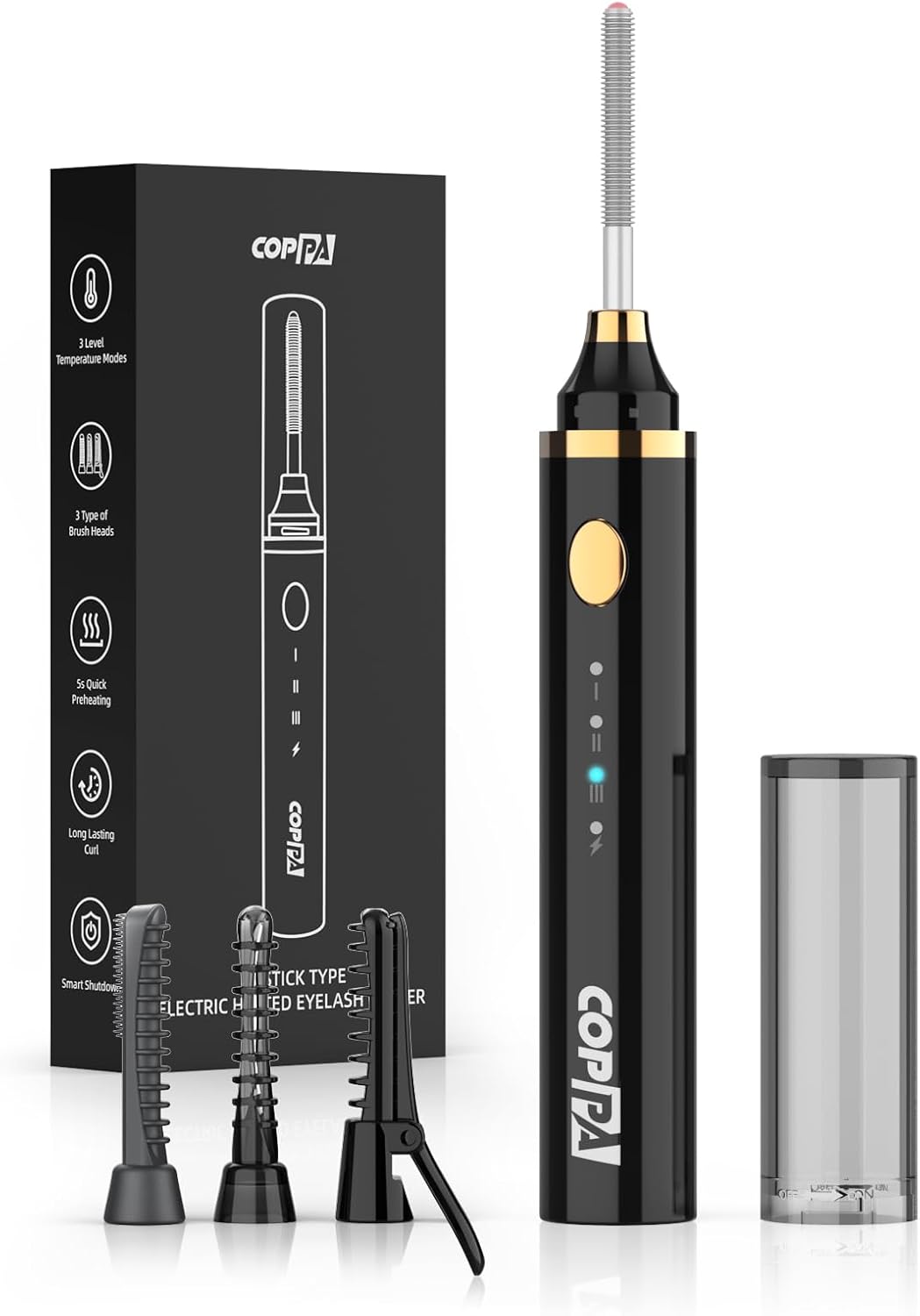COPPA Electric Lash Curler, LP-1 Lipstick Type 3-in-1 Heated Eyelash Curler with 3 Brush Heads 3 Curling Modes and 3 Temp & 5s Quick Heat-up, Perfect for Beginners and Makeup Pros, Black