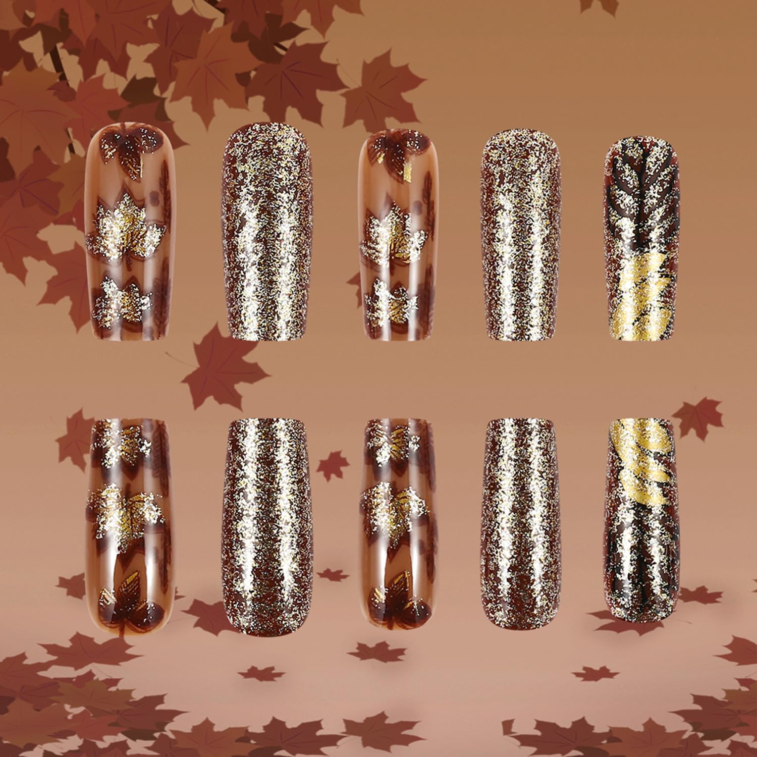 Vintage Thanksgiving Press on Nails Fall Glitter Maple Leaves Fake Nails Long Square Acrylic Glue on Nail Matte Autumn Maple Leaf Stick on Nail for Women DIY Manicure